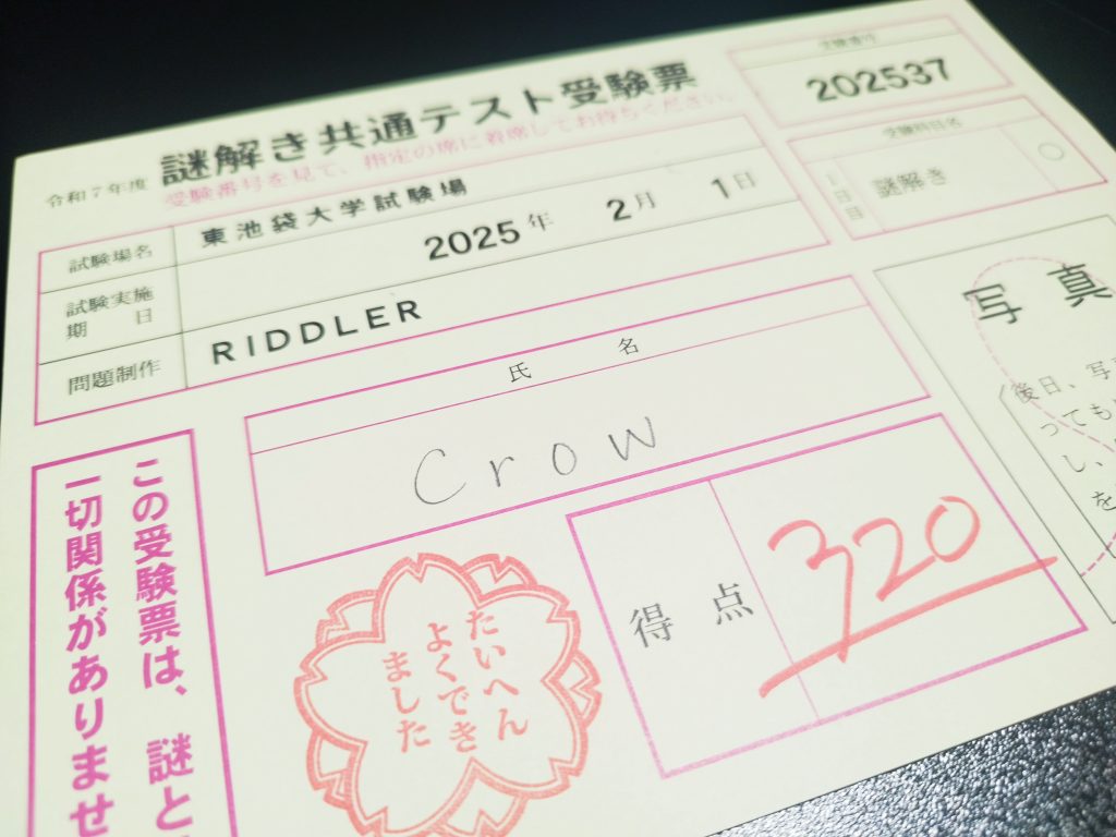 好みは人それぞれだと思いますが、私はRIDDLERの「謎解き共通テスト2025」のほうが好みですね。金額、謎の内容、終わったあとの満足感、あとわちさんがいた、すべてでこちらのほうが好み。あくまで私の好みね。
